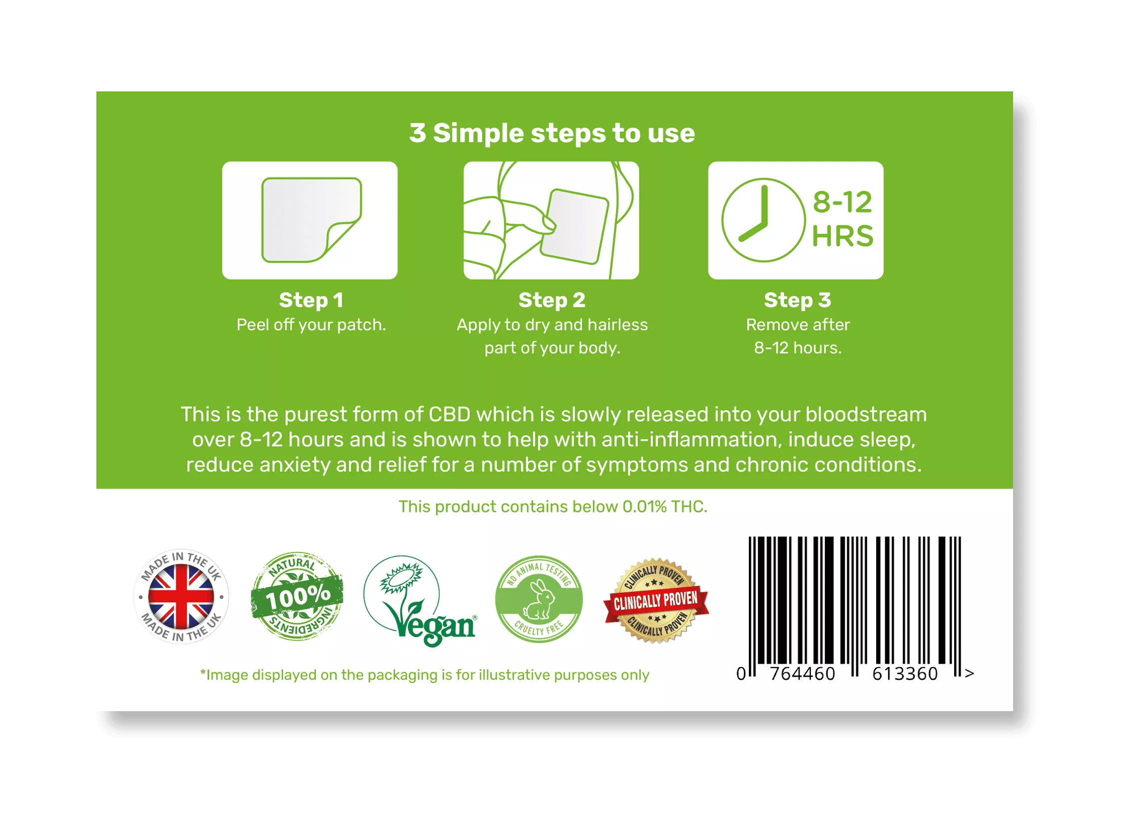 Each patch contains 16mg of CBD. Recommended usage is 1 patch per day. For external use only. Ensure skin is clean, dry and free of hair. Apply the patch directly onto any area of the body that is not covered in hair, avoiding the face, neck and genital area. Replace patches every 24 hours. After you have removed the patch, some adhesive or its residue may remain on your skin, this will wash away easily with soap and warm water.