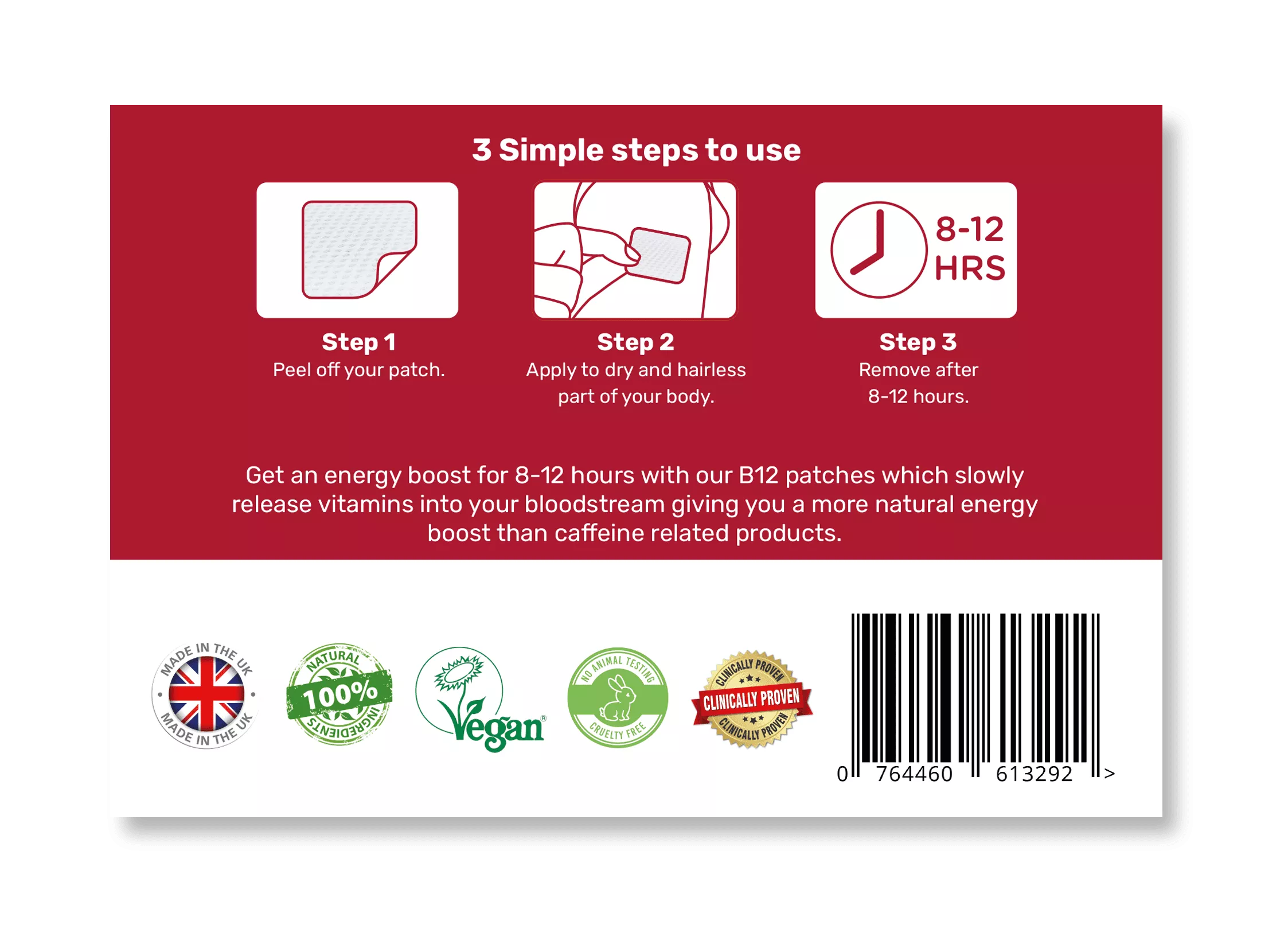 Our B12 Pro topical patches contain all 8 B vitamins with B12 being the major component. B12 is key for so many bodily functions, including reproduction of red blood cells, energy production & reduce fatigue.